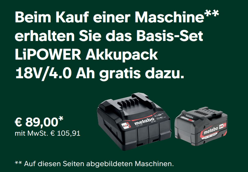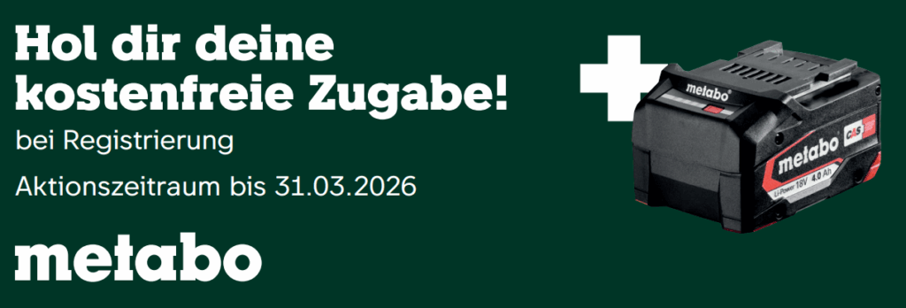 Profitieren Sie jetzt von unserer exklusiven metabo-Aktion! Hochwertige Akkugeräte mit kostenlosen Beigabe zu unschlagbaren Preisen, ideal für Profis und Handwerker. Die Aktion ist gültig bis zum 31.03.2026 – jetzt zugreifen und sparen!