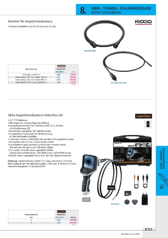 Lieferung: Inspektionskamera, Kabel 1,5 m lang, Li-Ion-Akku 3,7 V/2,8 Ah, Greif-, Schneid-, Schlagwerkzeuge